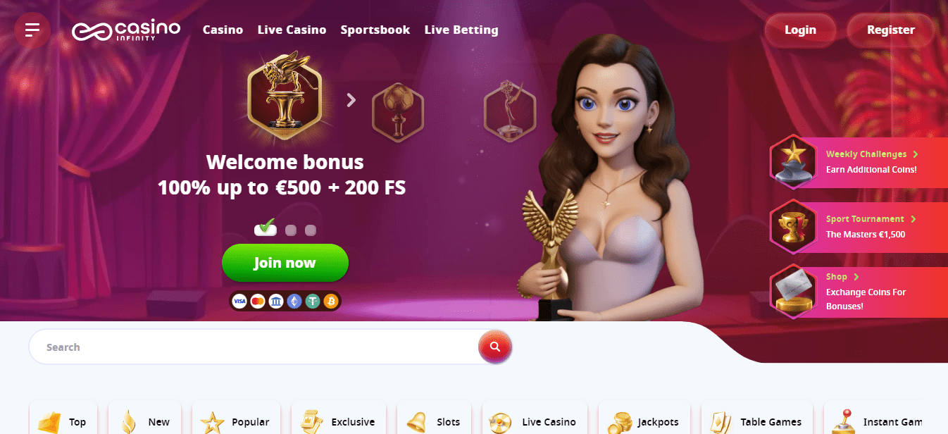 Die neuesten und beliebtesten Softwareanbieter bieten im Online-Casino Casino Infinity eine große Auswahl an Spielen an. Sie können Ihre bevorzugte Sprache aus der Liste der verfügbaren Sprachen unten im Casino auswählen. Mit jedem Gerät, einschließlich der neuesten Web- oder Mobilplattform, können Sie ein Konto erstellen.