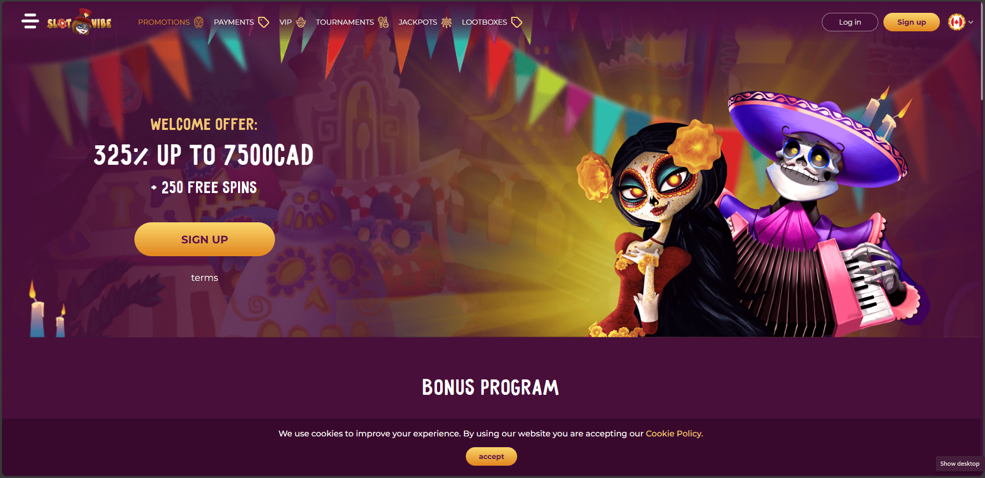 Die Hauptmerkmale ihrer Casinos sind die großen Spielbibliotheken, die große Auswahl an Werbeaktionen und der mehrsprachige Kundensupport, und SlotVibe ist keine Ausnahme. Es verfügt auch über eine sehr schöne Website mit Cartoon-Design und lebendigen Grafiken, die wahrscheinlich vom mexikanischen Día de Los Muertos inspiriert ist, da sie mit lustigen Figuren in themenbezogenen Gewändern versehen ist.